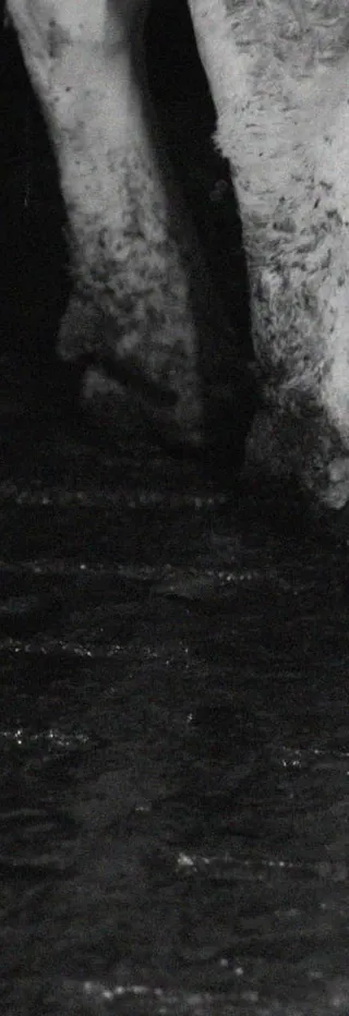 A close-up of gloved hands holding a syringe, preparing for an injection. The blurred background shows a black and white silhouette of a cow, emphasizing a clinical and unsettling environment.